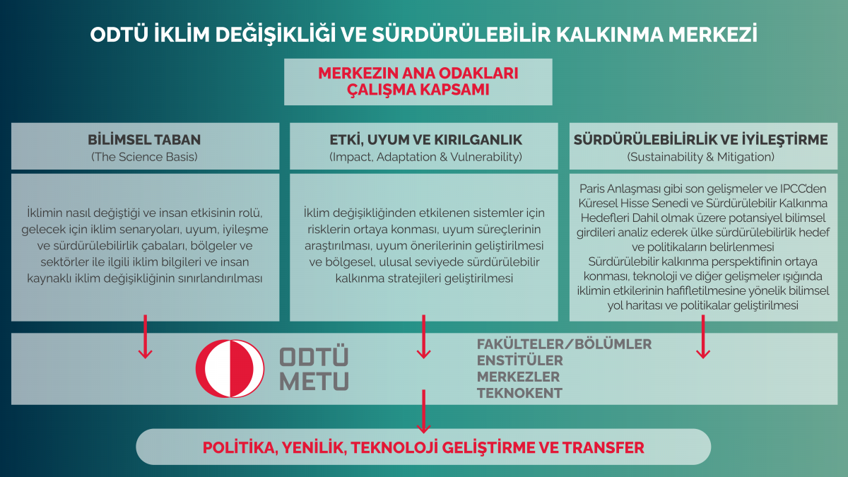 Both the society and the physical infrastructures are directly impacted by climate change and its consequences. Mitigating these impacts and ensuring the adaptation of societies and infrastructures to changing environmental conditions and the sustainability of resources is possible only through long-term science-based strategies and policies. The main goal of the METU CLIMATE is to contribute at the national and international levels to the development of scientific, realistic and reliable climate and sustainable development strategies and policies required by our country and society.